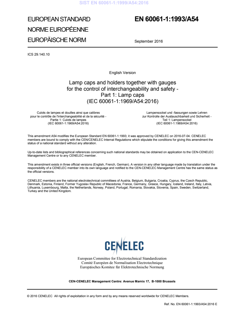 The EN 60061-1:1993/A54:2016 standard, issued by CLC, focuses on lamp caps and holders together with gauges for the control of interchangeability and safety, specifically targeting Part 1: Lamp caps. This European standard aligns with the International Electrotechnical Commission's IEC 60061-1 series and represents a consolidated edition incorporating extensive amendments and supplements up to 2016.