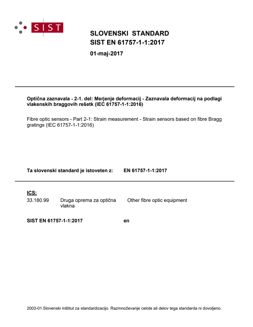 Optična zaznavala - 2-1. del: Merjenje deformacij - Zaznavala deformacij na podlagi vlakenskih braggovih rešetk (IEC 61757-1-1:2016)