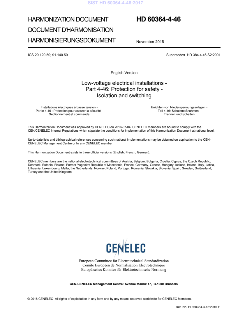 This document (HD 60364-4-46:2016) was prepared by CLC/TC 64 “Electrical installations and