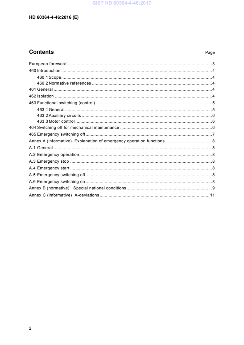 HD 60364-4-46:2016 is a standardization document published by CLC. Its full title is "Low-voltage electrical installations - Part 4-46: Protection for safety - Isolation and switching". This standard covers: This Harmonization Document deals with – non-automatic local and remote isolation and switching measures which prevent or remove dangers associated with electrical installations or electrically powered equipment; and – switching for the control of circuits or equipment.