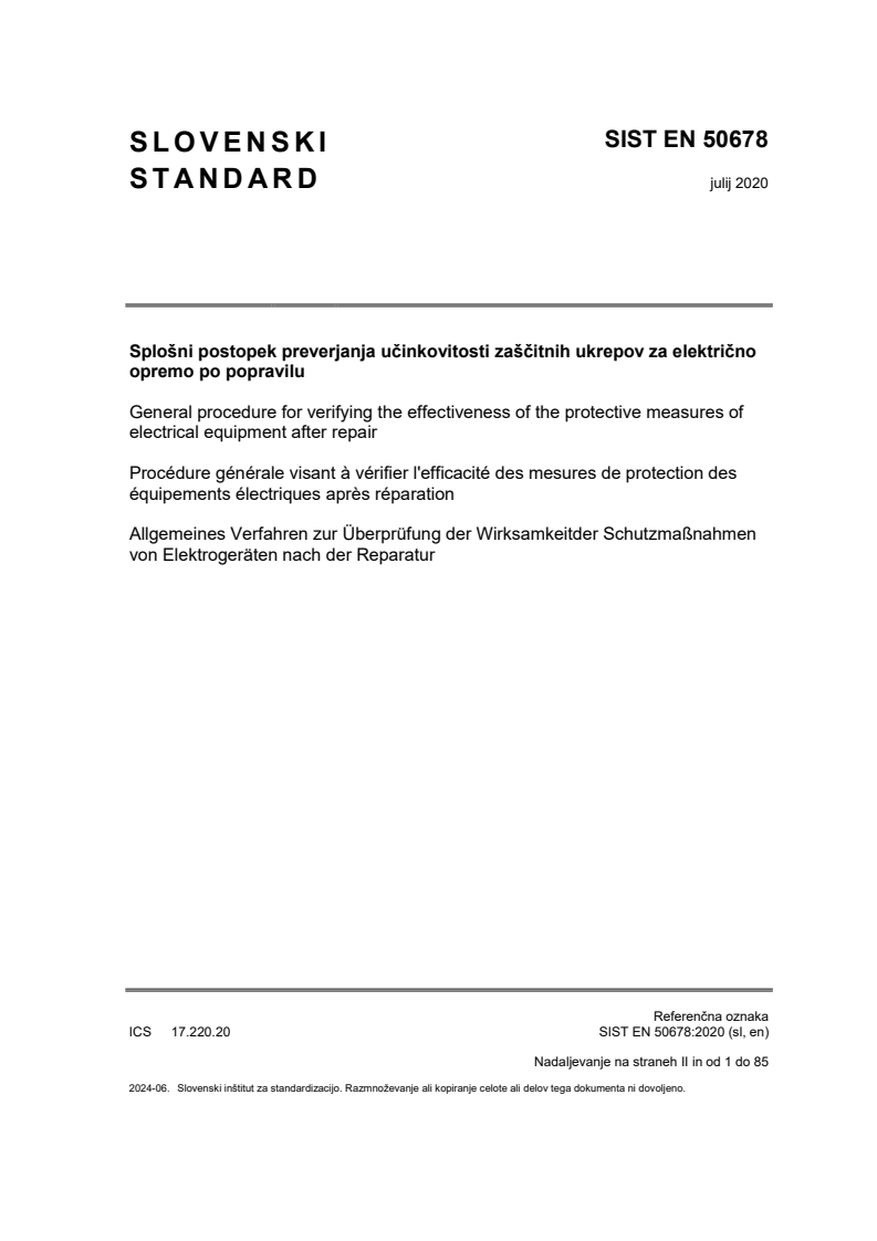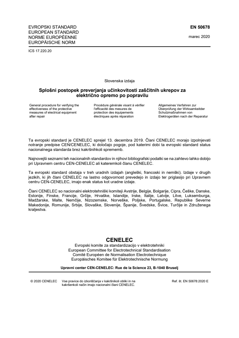EN 50678:2020 is a standard published by CLC. Its full title is "General procedure for verifying the effectiveness of the protective measures of electrical equipment after repair". This standard covers: This document specifies requirements for setting a uniform procedure to verify the effectiveness of the protective measures for current-using equipment or appliances after they have been repaired. This procedure is applicable to current-using equipment or appliances with a rated voltage above 25 V AC and 60 V DC up to 1 000 V AC and 1 500 V DC, and currents up to 63 A, connected to final circuits. They may be either pluggable equipment type A connected or permanently connected. This document is not intended to replace test covered by safety standards nor product standards, for example type tests, routine tests and acceptance tests. This document assumes that the current-using equipment or appliances under consideration complies with its related product standard, has been introduced on the market, has been in use, has failed, and has then been repaired. It intends to verify that operations for repairs have not jeopardized basic protective measures, for example to verify the continuity of the protective conductor, the withstand capability of the insulation or to verify that no metallic part is loose or is inadvertently inserted in the device. This document does not apply to: - recurrent tests defined in EN 50699; - devices and equipment that are part of the fixed electrical installations. For these, tests for verification after repair are covered by HD 60364 6; - audio/video, information and communication technology equipment; - uninterruptible Power Supply (UPS); - charging stations for electro-mobility; - power supplies; - programmable Logic Controllers (PLC); - power Drives; - devices for EX-zones or for mining applications in general; - products already covered by standards addressing similar topics such as: - medical equipment covered by EN 60601 1. For these devices, tests for verification after repair are covered by EN 62353; - arc welding equipment covered by EN IEC 60974 1. For these devices, tests for verification after repair are covered by EN 60974 4. - machinery covered by EN 60204-1. For these devices, EN 60204-1 applies.