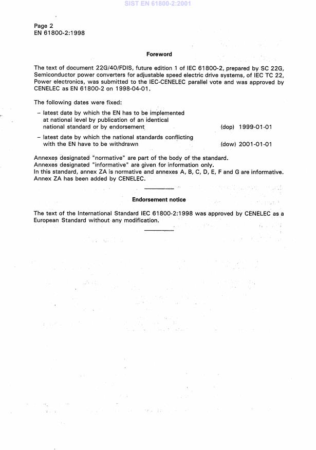 EN 61800-2:1998 is a standard published by CLC. Its full title is "Adjustable speed electrical power drive systems - Part 2: General requirements - Rating specifications for low voltage adjustable frequency a.c. power drive systems". This standard covers: Applies to general purpose adjustable speed a.c. drive systems which include power conversion, control equipment, and also an a.c. motor or motors. Excluded are tractional and electrical vehicle drives. Applies to systems connected to line voltages up to 1 kV a.c., 50 Hz or 60 Hz, and load side frequency up to 600 Hz.