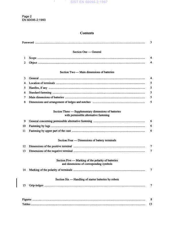 EN 60095-2:1993 is a standard published by CLC. Its full title is "Lead-acid starter batteries - Part 2: Dimensions of batteries and dimensions and marking of terminals". This standard covers: Applies to lead-acid batteries used for starting, lighting and ignition of passenger automobiles and light commercial vehicles with a nominal voltage of 12 V fastened to the vehicles by means of ledges on the long sides of the battery case, two alternative admissible means are specified in Section Three. Specifies: -the main dimensions of starter batteries of four standard series; -the location of the positive and negative terminals with respect to the fastening system; -the dimensions of tapered terminals of starter batteries; -the marking of the polarity.