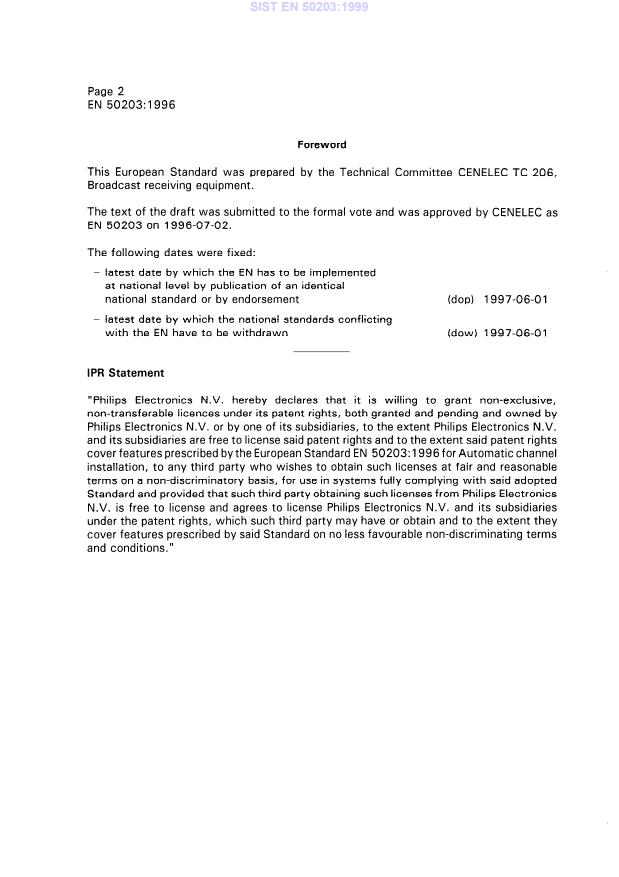 EN 50203:1996 is a standard published by CLC. Its full title is "Automatic channel installation (ACI)". This standard covers: This document specifies elements and describes characteristics for remote channel-installation of TV and VCR sets, by use of teletext