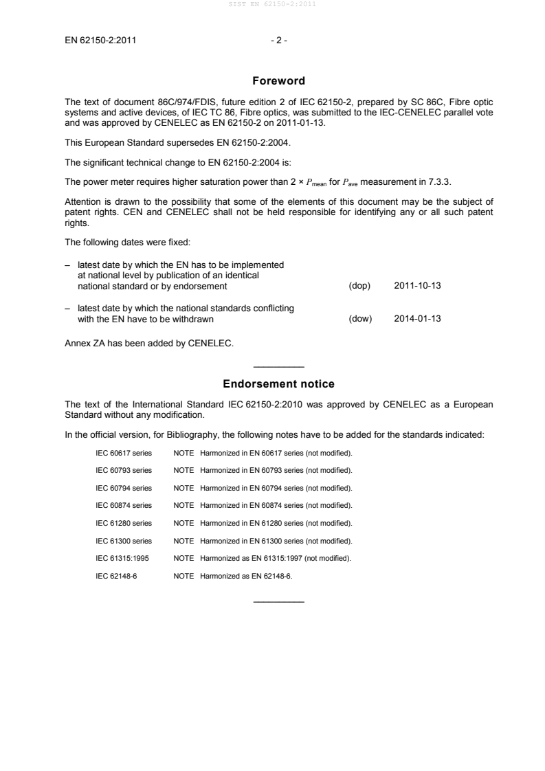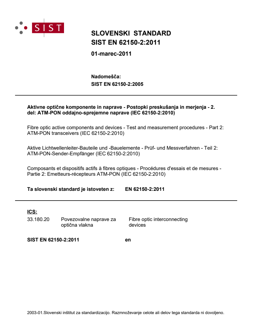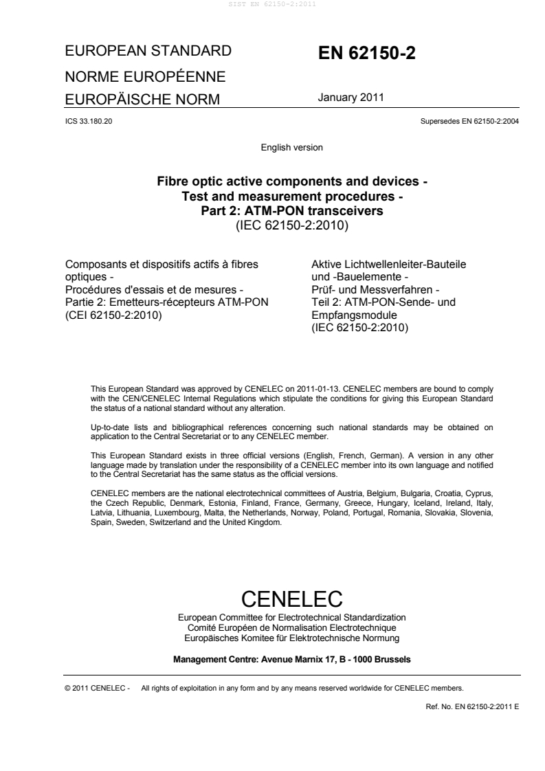 Keywords: EN 62150-2:2011, IEC 62150-2, ATM‑PON transceivers, fibre optic transceivers, PON testing, test and measurement procedures, mean launched power, receiver sensitivity, extinction ratio.