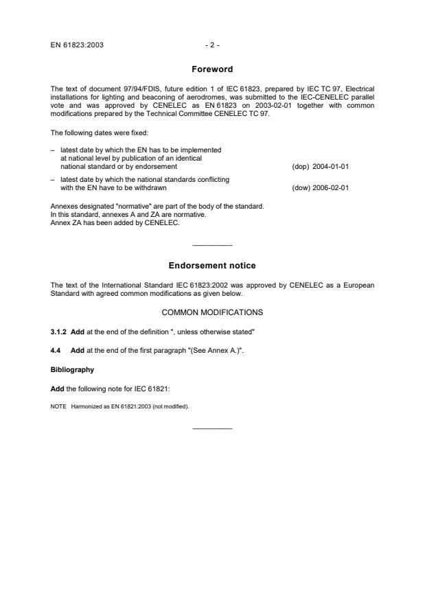 In this standard, annexes A and ZA are normative. Annex ZA has been added by CENELEC. __________ Endorsement notice The text of the International Standard IEC 61823:2002 was approved by CENELEC as a European Standard with agreed common modifications as given below. COMMON MODIFICATIONS 3.1.2 Add at the end of the definition ", unless otherwise stated" 4.4 Add at the end of the first paragraph "(See Annex A.)". Bibliography Add the following note for IEC 61821: NOTE