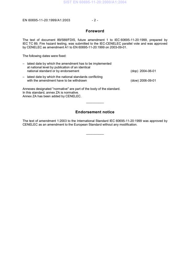 This amendment A1 modifies the European Standard EN 60695-11-20:1999; it was approved by