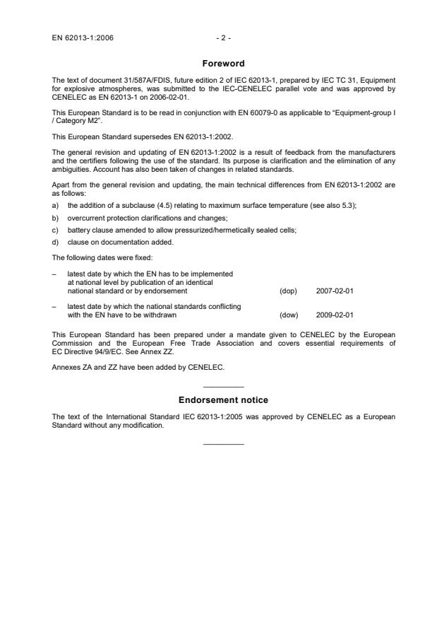 EN 62013-1:2006 has the following relationships with other standards: It is inter standard links to EN 62013-1:2002, EN 60079-35-1:2011. Understanding these relationships helps ensure you are using the most current and applicable version of the standard.