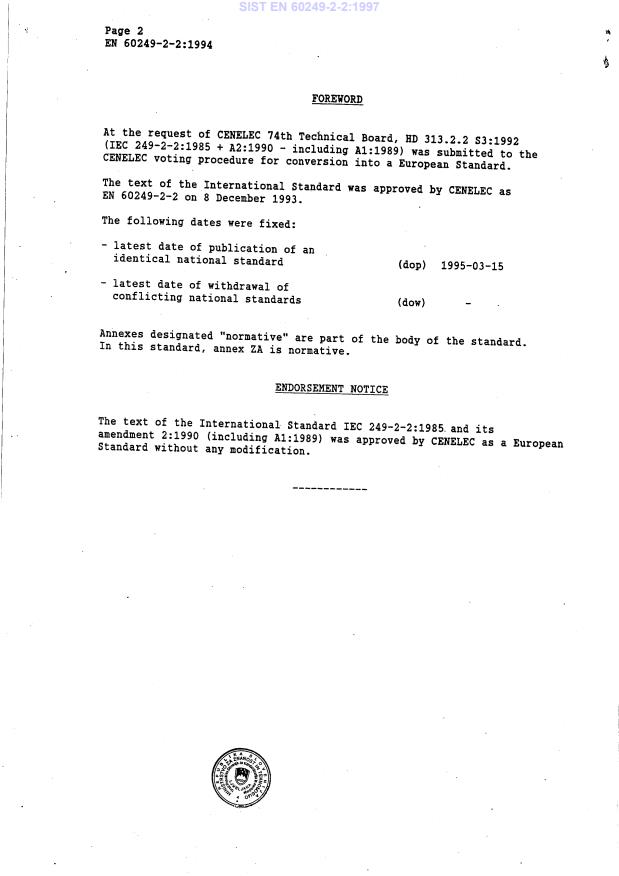 EN 60249-2-2:1994 has the following relationships with other standards: It is inter standard links to EN 60249-1:1993, EN 81-1:1998+A3:2009, EN 81-3:2000+A1:2008, EN 81-2:1998+A3:2009, EN 60065:2014, EN 60249-2-2:1994/A4:1995, EN 60249-2-2:1994/A5:2000, EN 60249-2-2:1994/A3:1994. Understanding these relationships helps ensure you are using the most current and applicable version of the standard.