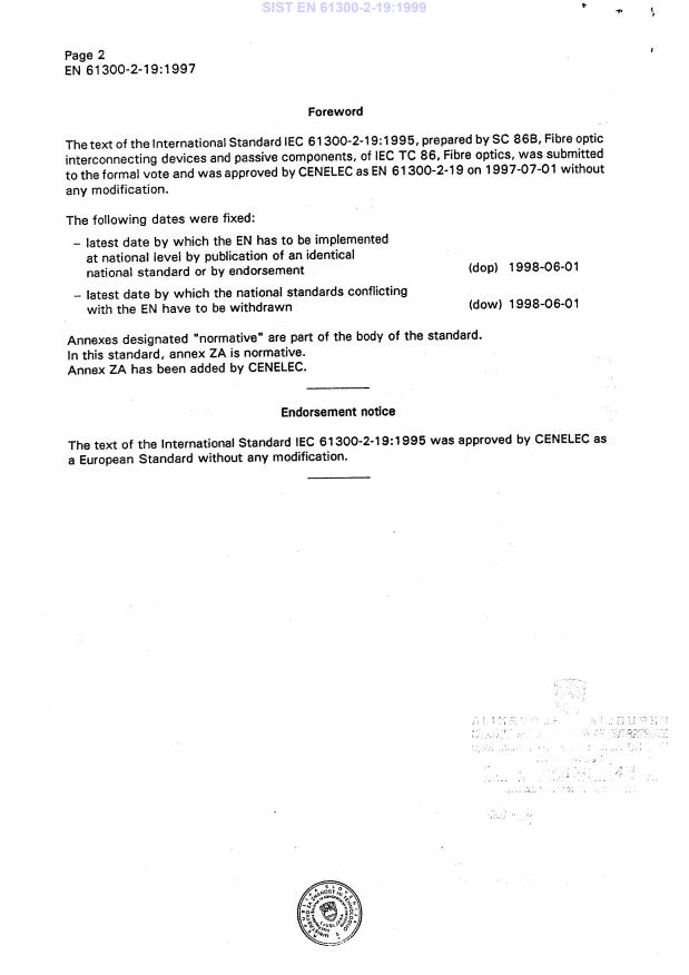 EN 61300-2-19:1997 has the following relationships with other standards: It is inter standard links to EN 61300-2-19:2005, HD 323.2.3 S2:1987, EN 62149-5:2003, EN 61753-051-3:2002, EN 61291-5-2:2002, EN 61753-022-2:2003, EN 61753-052-3:2002, EN 61753-021-2:2002, EN 62149-1:2004, EN 61753-121-3:2010, EN 61753-2-3:2001, EN 61300-1:2011, EN 61753-2-1:2000. Understanding these relationships helps ensure you are using the most current and applicable version of the standard.