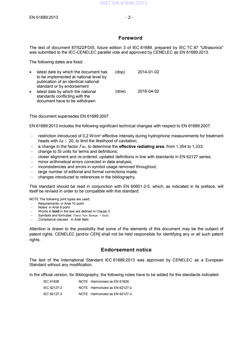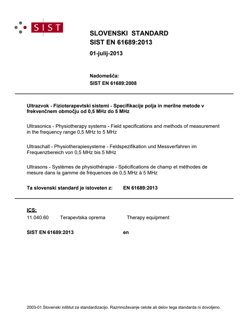 EN 61689:2013 is a standard published by CLC. Its full title is "Ultrasonics - Physiotherapy systems - Field specifications and methods of measurement in the frequency range 0,5 MHz to 5 MHz". This standard covers: IEC 61689:2013 is applicable to ultrasonic equipment designed for physiotherapy containing an ultrasonic transducer generating continuous or quasi-continuous wave ultrasound in the frequency range 0,5 MHz to 5 MHz. This standard only relates to ultrasonic physiotherapy equipment employing a single plane non-focusing circular transducer per treatment head, producing static beams perpendicular to the face of the treatment head. This standard specifies: - methods of measurement and characterization of the output of ultrasonic physiotherapy equipment based on reference testing methods; - characteristics to be specified by manufacturers of ultrasonic physiotherapy equipment based on reference testing methods; - guidelines for safety of the ultrasonic field generated by ultrasonic physiotherapy equipment; - methods of measurement and characterization of the output of ultrasonic physiotherapy equipment based on routine testing methods; - and acceptance criteria for aspects of the output of ultrasonic physiotherapy equipment based on routine testing methods. Therapeutic value and methods of use of ultrasonic physiotherapy equipment are not covered by the scope of this standard. This third edition cancels and replaces the second edition published in 2007. It constitutes a technical revision which includes the following significant technical changes with respect to the previous edition: - restriction introduced of 0,2 W/cm2 effective intensity during hydrophone measurements for treatment heads with ka≤20, to limit the likelihood of cavitation; - change in the factor Fac, to determine the effective radiating area, from 1,354 to 1,333; - and change to SI units for terms and definitions.