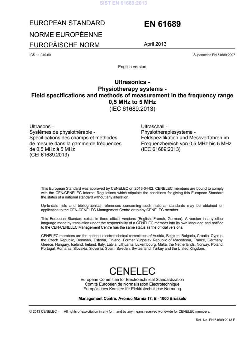 ICS 11.040.60 Supersedes EN 61689:2007