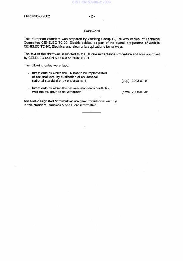 EN 50306-3:2002 is a standard published by CLC. Its full title is "Railway applications - Railway rolling stock cables having special fire performance - Thin wall - Part 3: Single core and multicore cables (pairs, triples and quads) screened and thin wall sheathed". This standard covers: EN 50306-3 specifies requirements for, and constructions and dimensions of, multicore cables, rated 300 V to earth, of the following type: Screened (0,5 mm2 to 2,5 mm2, number of cores from 1 to 4) All cables have stranded tinned copper conductors, and thin wall thickness, halogen-free, insulation and sheath. They are for use in railway rolling stock as fixed wiring, or wiring where limited flexing in operation is encountered. The requirements provide for a continuous operational life at temperatures of 90 °C or 105 °C dependent upon the sheath system type. NOTE 1 For cables with type S2 sheath a temperature of 105 °C is only allowed when specifically tested for the higher rating (i.e. by long-term thermal endurance testing to demonstrate a lifetime of at least 20 000 h at 125 °C). The maximum temperature for short-circuit conditions is 160 °C based on a duration of 5 s. Under fire conditions the cables exhibit special performance characteristics in respect of maximum permissible flame propagation (flame spread) and maximum permissible emission of smoke and toxic gases. These requirements are specified to permit the cables to satisfy Hazard Levels 2, 3 or 4 of EN 45545-1 1). NOTE 2 Requirements for the emission of smoke and gases are not specified for cables used for Hazard Level 1 of EN 45545-1. NOTE 3 EN 45545-1 is still under development and should be consulted. EN 50306-3 should be used in conjunction with EN 50306-1, General Requirements, and EN 50306 2, Single core cables.