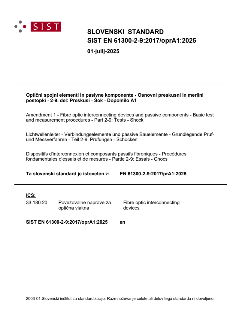 Ta slovenski standard je istoveten z: EN 61300-2-9:2017/prA1:2025