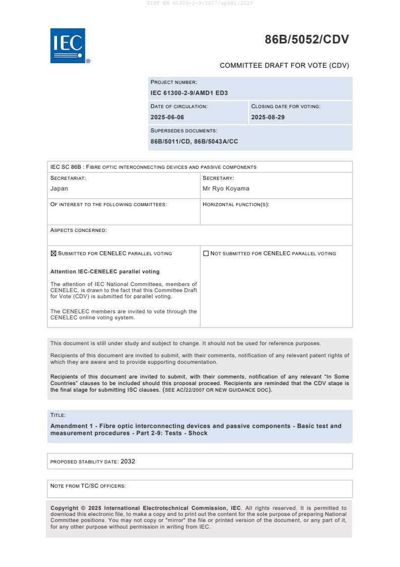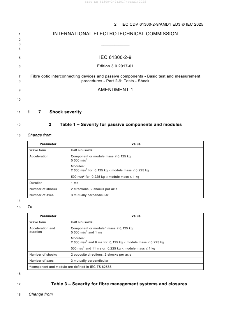 EN 61300-2-9:2017/prA1:2025 is a draft published by CLC. Its full title is "Amendment 1 - Fibre optic interconnecting devices and passive components - Basic test and measurement procedures - Part 2-9: Tests - Shock". This standard covers: Amendment 1 - Fibre optic interconnecting devices and passive components - Basic test and measurement procedures - Part 2-9: Tests - Shock