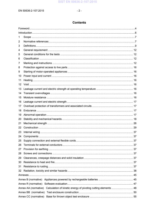 Contents Foreword.4 Introduction .6 1 Scope .7 2 Normative references .7 3 Definitions .9 4 General requirement . 12 5 General conditions for the tests . 12 6 Classification . 12 7 Marking and instructions . 12 8 Protection against access to live parts . 16 9 Starting of motor-operated appliances . 16 10 Power input and current . 16 11 Heating . 16 12 Void . 16 13 Leakage current and electric strength at operating temperature . 16 14 Transient overvoltages . 16 15 Moisture resistance . 16 16 Leakage current and electric strength . 17 17 Overload protection of transformers and associated circuits . 17 18 Endurance . 17 19 Abnormal operation . 17 20 Stability and mechanical hazards . 18 21 Mechanical strength . 26 22 Construction . 29 23 Internal wiring . 37 24 Components . 37 25 Supply connection and external flexible cords . 37 26 Terminals for external conductors . 37 27 Provision for earthing . 37 28 Screws and connections . 37 29 Clearances, creepage distances and solid insulation . 37 30 Resistance to heat and fire . 37 31 Resistance to rusting . 37 32 Radiation, toxicity and similar hazards . 38 Annexes . 45 Annex B (normative)