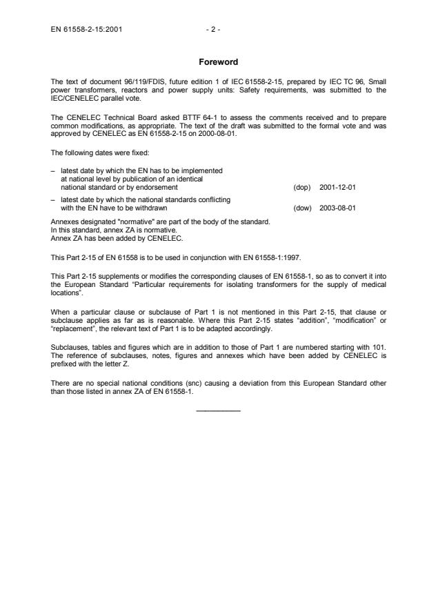 EN 61558-2-15:2001 is a standard published by CLC. Its full title is "Safety of power transformers, power supply units and similar - Part 2-15: Particular requirements for isolating transformers for the supply of medical locations". This standard covers: This part 2-15 of IEC 61558 applies to stationary, single-phase or polyphase, air-cooled (natural or forced) isolating transformers for the supply of group II medical locations, designed to be permanently connected to the fixed wiring of IT supply system. This standard also applies to transformers incorporating electronic circuits. This standard does not apply to external circuits and their components intended to be connected to the input and output terminals or socket-outlets of the transformer. It has the status of a group safety publication in accordance with IEC Guide 104. This part 2 is intended to be used in conjunction with IEC 61558-1.