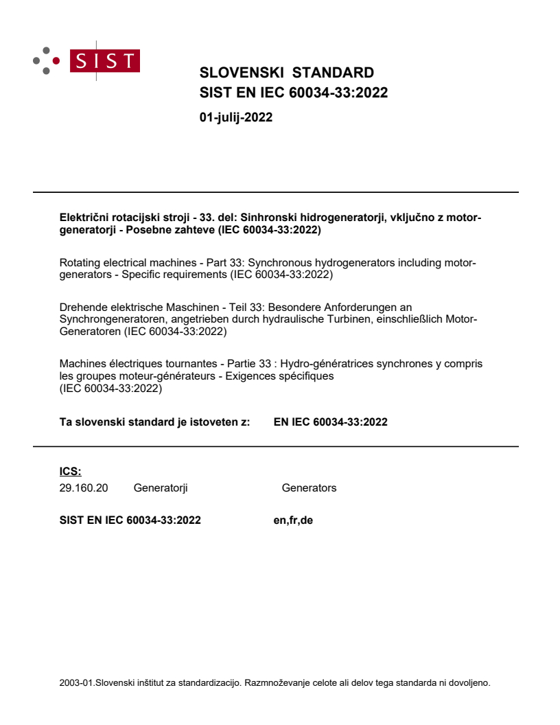 Električni rotacijski stroji - 33. del: Sinhronski hidrogeneratorji, vključno z motor-generatorji - Posebne zahteve (IEC 60034-33:2022)