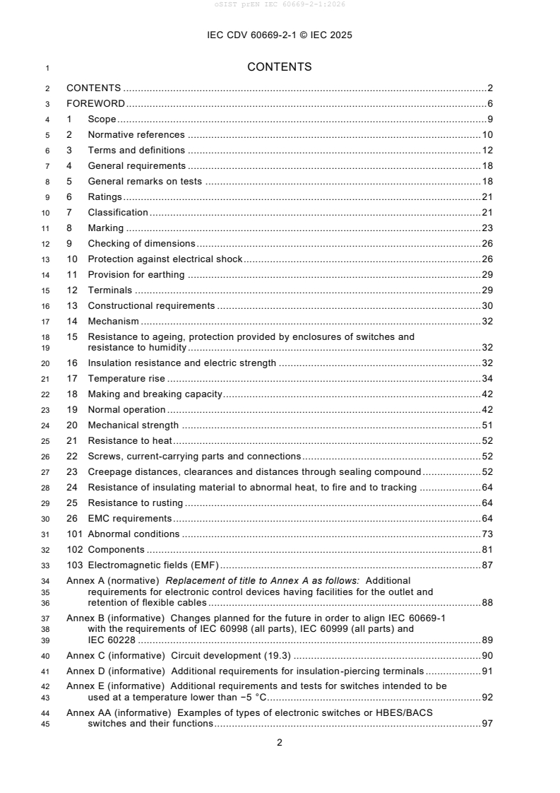 prEN IEC 60669-2-1:2026 is a draft published by CLC. Its full title is "Switches for household and similar fixed electrical installations - Part 2-1: Particular requirements - Electronic control devices". This standard covers: Switches for household and similar fixed electrical installations - Part 2-1: Particular requirements - Electronic control devices