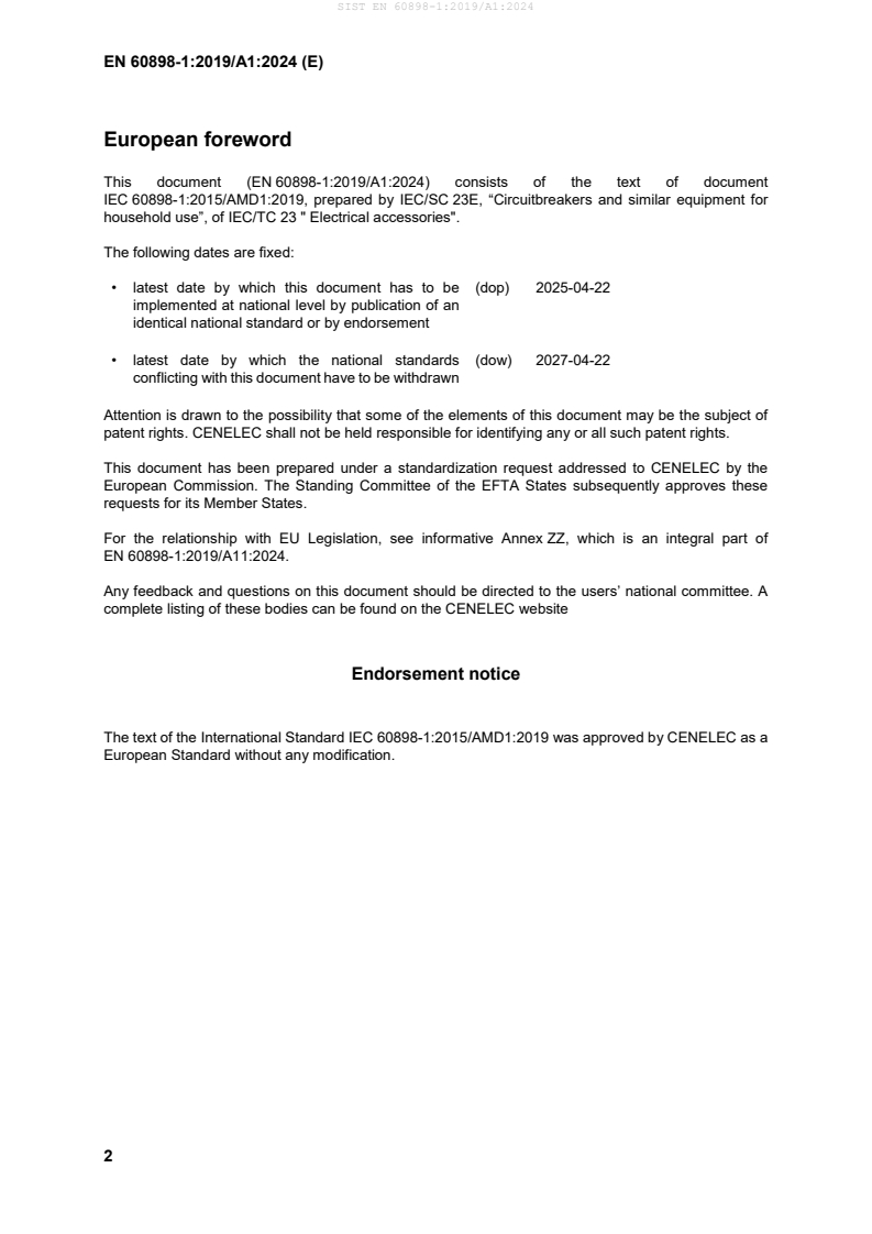 This amendment A1 modifies the European Standard EN 60898-1:2019; it was approved by CENELEC on 2024-04-22. CENELEC