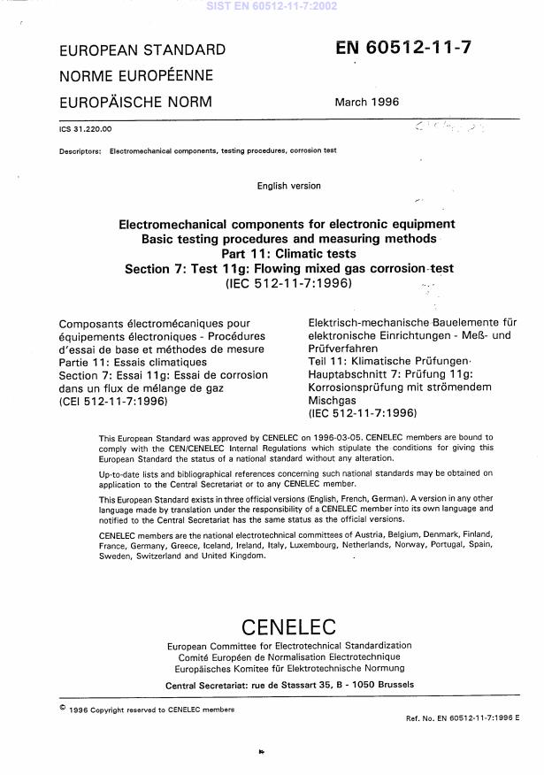 EN 60512-11-7:1996 is a standard published by CLC. Its full title is "Electromechanical components for electronic equipment - Basic testing procedures and measuring methods - Part 11: Climatic tests - Section 7: Test 11g: Flowing mixed gas corrosion test". This standard covers: Defines a standard test method to assess the effects of a controlled atmosphere polluted by gases at very low concentration on electrical contacts or connections.