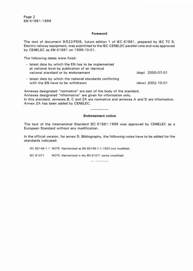 Attention is drawn to the possibility that some of the elements of this International Standard may be the subjectof patent rights. The IEC shall not be held responsible for identifying any or all such patent rights.International Standard IEC 61881 has been prepared by IEC technical committee 9: Electricrailway equipment.The text of this standard is based on the following documents:FDISReport on voting9/522/FDIS9/530/RVDFull information on the voting for the approval of this standard can be found in the report onvoting indicated in the above table.This publication has been drafted in accordance with the ISO/IEC Directives, Part 3.Annexes A and D are for information only.Annexes B and C form an integral part of this standard.The committee has decided that this publication remains valid until 2004. At this date, inaccordance with the committee's decision, the publication will be·reconfirmed;·withdrawn;·replaced by a revised edition; or·amended.