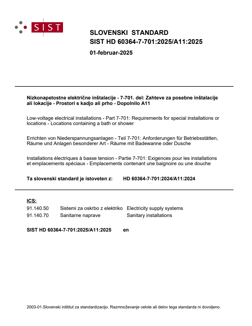 Nizkonapetostne električne inštalacije - 7-701. del: Zahteve za posebne inštalacije ali lokacije - Prostori s kadjo ali prho - Dopolnilo A11