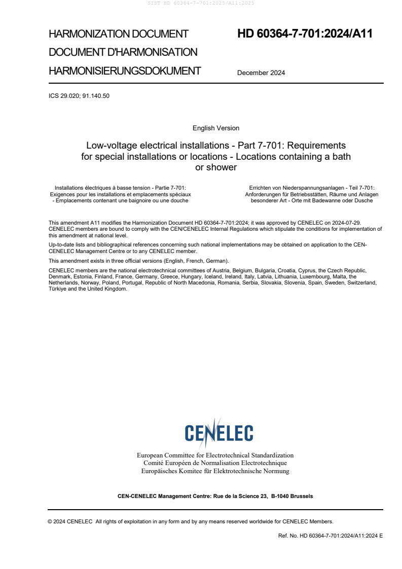 The HD 60364-7-701:2024/A11:2024 standard, issued by CLC, specifies requirements for low-voltage electrical installations in special locations containing a bath or shower. This standard provides updated harmonized modifications and national conditions to ensure safe electrical design and installation in wet environments to prevent electric shock risks and ensure regulatory compliance.
