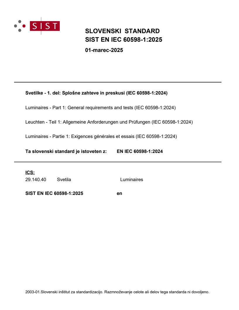 Svetilke - 1. del: Splošne zahteve in preskusi (IEC 60598-1:2024)
