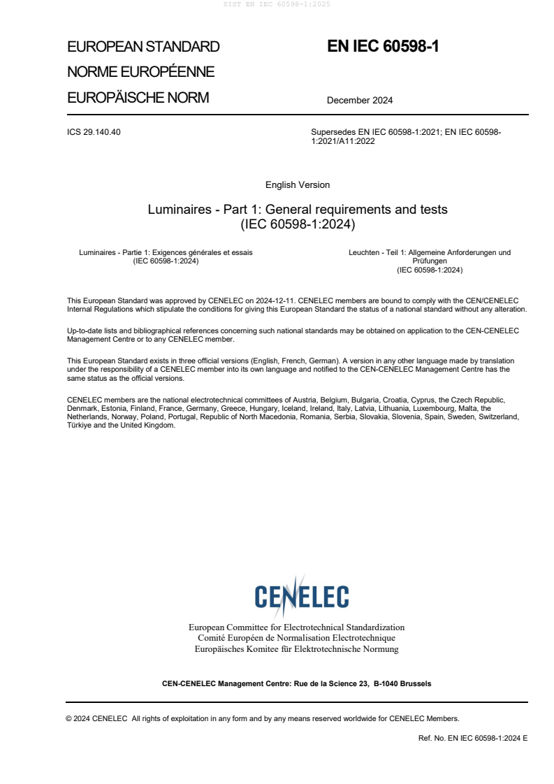 EN IEC 60598-1:2024 is a standard published by CLC. Its full title is "Luminaires - Part 1: General requirements and tests". This standard covers: IEC 60598-1:2024 specifies general safety requirements for luminaires, incorporating electric light sources for operation from supply voltages up to 1 000 V. Requirements for semi-luminaires are included in this document. This tenth edition cancels and replaces the ninth edition published in 2020. This edition constitutes a technical revision. This edition includes the following significant technical changes with respect to the previous edition: a) new structure to comply with the ISO/IEC Directives, Part 2; b) addition of a new Annex V for comparison with the previous edition; c) revision of 7.32 for SPDs and for SPCs; d) the terms "live part" and "active part" were reviewed and aligned with the definitions of "live part" and "hazardous live part" given in IEC 60050-195; e) revision of 7.14.2 for conductor mechanical stress; f) revision of 14.5.2, Item 4 to include controlgear; g) revision of 9.2.1 (Earthing) with the deletion of the word "permanently"; h) revision of Annex N: earth continuity test time; i) revision of 7.11.4; 7.14.1; Table 22 (14.4.3): Introduction of requirements for suspension by magnets; j) addition of a new Annex W for luminaires using batteries; k) clarification of Clause 6 for marking requirements for nature of supply; l) addition of a new Subclause 7.31.5: Additional requirements for luminaires using controllable controlgear providing SELV output(s); m) revision of 6.4.16: Information to be provided for luminaire having protective earth current > 10 mA; n) revision of 6.3.23; 6.4.18; 6.4.24; 7.30 and 10.2.1 for serviceable, non-user serviceable and non-serviceable components; o) revision of Annex D: Draught-proof enclosure; p) revision of 8.2.1 and 13.2.1: Inconsistencies in the inclusion of the limits of voltage ranges; q) revision of 9.2.10 for looping-in; r) Revision of Clause 2 and 7.8: update of the reference to IEC 61058-1-1, IEC 61058-1-2 and IEC 6105821. Update of temperature limits in Table 21 (14.4.3) for luminaires incorporating switches according to IEC 60669-1 or IEC 60669-2-1; s) revision of 6.3.22 and 7.24 for photobiological safety; t) addition of a new Subclause 6.3.27 for marking of mains socket outlet moved from information requirements.