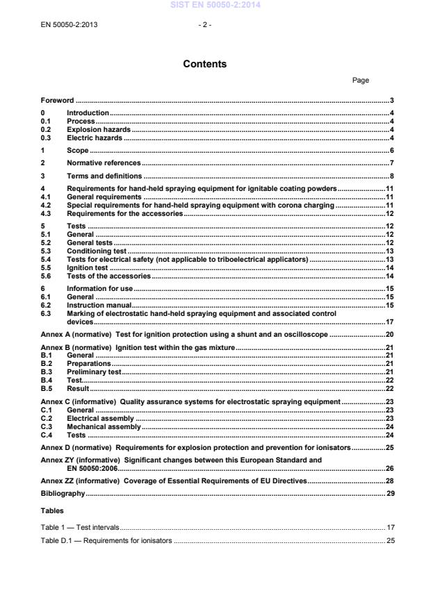 EN 50050-2:2013 is a standard published by CLC. Its full title is "Electrostatic hand-held spraying equipment - Safety requirements - Part 2: Hand-held spraying equipment for ignitable coating powder". This standard covers: 1.1 This European Standard specifies the requirements for hand-held or hand-operated electrostatic spraying equipment for ignitable coating powders within a temperature range from 5 °C to 40 °C to be used in explosive atmospheres generated by their own spray cloud. This European Standard deals with all electrical hazards significant for the electrostatic spraying of coating powders, which could also contain small quantities of added metal particles, if the work is carried out under conditions recommended by the manufacturer. In particular, this includes ignition hazards resulting from the generated explosive atmosphere. This European Standard specifies the design-related and test requirements for electrostatic spraying equipment of type A-P according to Table 1 of EN 50177:2009. 1.2 With regard to explosion protection and prevention measures, this standard also applies to ionisators with corona charging. Ionisators used together with or under similar conditions as electrostatic spraying equipment for ignitable coating powders are considered to be equipment of group II, category 2D for use in potentially explosive areas of zone 21 or 22. All other parts of ionisators are considered to be equipment of category 3D if they are installed or used in potentially explosive areas of zone 22. 1.3 Electrostatic applicators are considered to be equipment of group II, category 2D for use in potentially explosive areas of zone 21 or 22, which have been generated by the equipment itself. All other parts of hand-held electrostatic spraying equipment are considered to be equipment of category 3D if they are installed or used in potentially explosive areas of zone 22, see Annex D. 1.4 All other significant hazards relevant for applicators (e.g. ejection of powder, mechanical strength, electrical hazards (apart from the electrostatic hazards)), noise, explosion, contract with or inhalation of dangerous substances, ergonomics) are covered by EN 1953. 1.5 This European Standard also gives details regarding quality assurance systems for electrostatic spraying equipment, see Annex C. 1.6 Additional requirements may be applicable to equipment designed for use in food and pharmaceutical industry. 1.7 This European Standard does not apply to zone classification of the areas in and around spray booths [see EN 12981], zone classification of other areas with potentially explosive atmosphere [see EN 60079-10-2], selection, erection and application of other electrical and non-electrical equipment in areas with explosion hazard [see EN 60079 14 and EN 12981], cleaning of spraying areas, see instruction manual of the spraying equipment, fire prevention and protection, for instance fire hazards due to other sources [see EN 12981], dust hazards [see EN 12981].