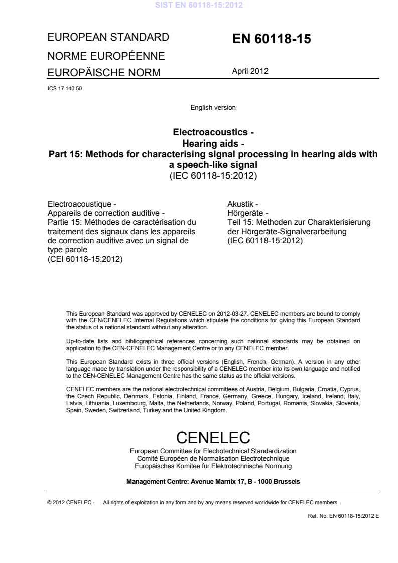 EN 60118-15:2012 is a standard published by CLC. Its full title is "Electroacoustics - Hearing aids - Part 15: Methods for characterising signal processing in hearing aids with a speech-like signal". This standard covers: IEC 60118-15:2012 specifies a test signal designed to represent normal speech, the International Speech Test Signal (ISTS), together with the procedures and the requirements for measuring the characteristics of signal processing in air-conduction hearing aids. The measurements are used to derive the estimated insertion gain (EIG). For the purposes of characterizing a hearing aid for production, supply and delivery, the procedures and requirements to derive the coupler gain on a 2 cm3 coupler as defined in IEC 60318-5 are also specified. The purpose of this standard is to ensure that the same measurements made on a hearing aid following the procedures described, and using equipment complying with these requirements, give substantially the same results. Measurement methods that take into account the acoustic coupling of a hearing aid to the individual ear and the acoustic influence of the individual anatomical variations of an end-user on the acoustical performance of the hearing aid, known as real-ear measurements, are outside the scope of this particular standard.