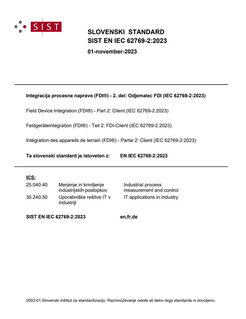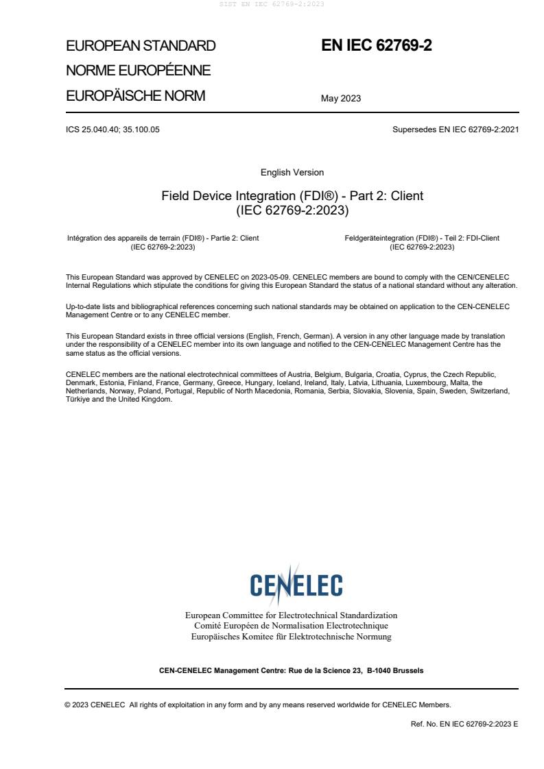 EN IEC 62769-2:2023 (IEC 62769-2:2023) specifies the Field Device Integration (FDI®) - Part 2: Client. It defines the FDI Client component within the FDI architecture, describing services, models and interfaces used by client applications to access, present and interact with field devices in industrial measurement and control systems. The edition 3.0 (2023) document is the International Standard adopted by CENELEC and supersedes the 2021 edition. Note: FDI® is a registered trademark; compliance with the standard does not require using the trade name.