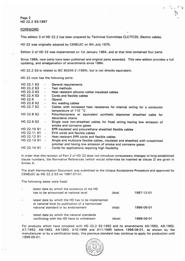 HD 22.2 S3:1997 is a standardization document published by CLC. Its full title is "Cables of rated voltages up to and including 450/750 V and having cross-linked insulation - Part 2: Test methods". This standard covers: Hd 22 applies to rigid and flexible cables with insulation and sheath, if any, based on vulcanised rubber, of rated voltage Uo/U up to and including 450/750 V used in power installations of nominal voltage not exceeding 450/750 V a.c. This Part 2 specifies the methods of carrying out the tests specified in HD 22 in conjunction with HD 405 and EN 60811. General Requirements are specified in HD 22.1. Particular types of cable are specified in HD 22 Part 3 onwards, and are hereafter referred to as "the particular specifications".