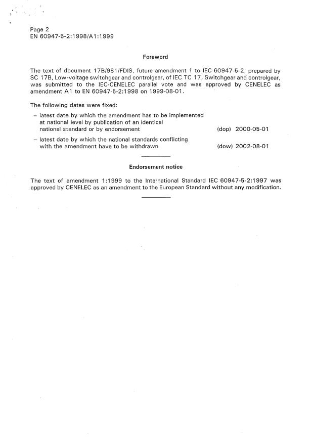 EN 60947-5-2:1998/A1:1999 is a amendment published by CLC. Its full title is "Low-voltage switchgear and controlgear - Part 5-2: Control circuit devices and switching elements - Proximity switches". This standard covers: EN following parallel vote * Superseded by EN 60947-5-2:2007
