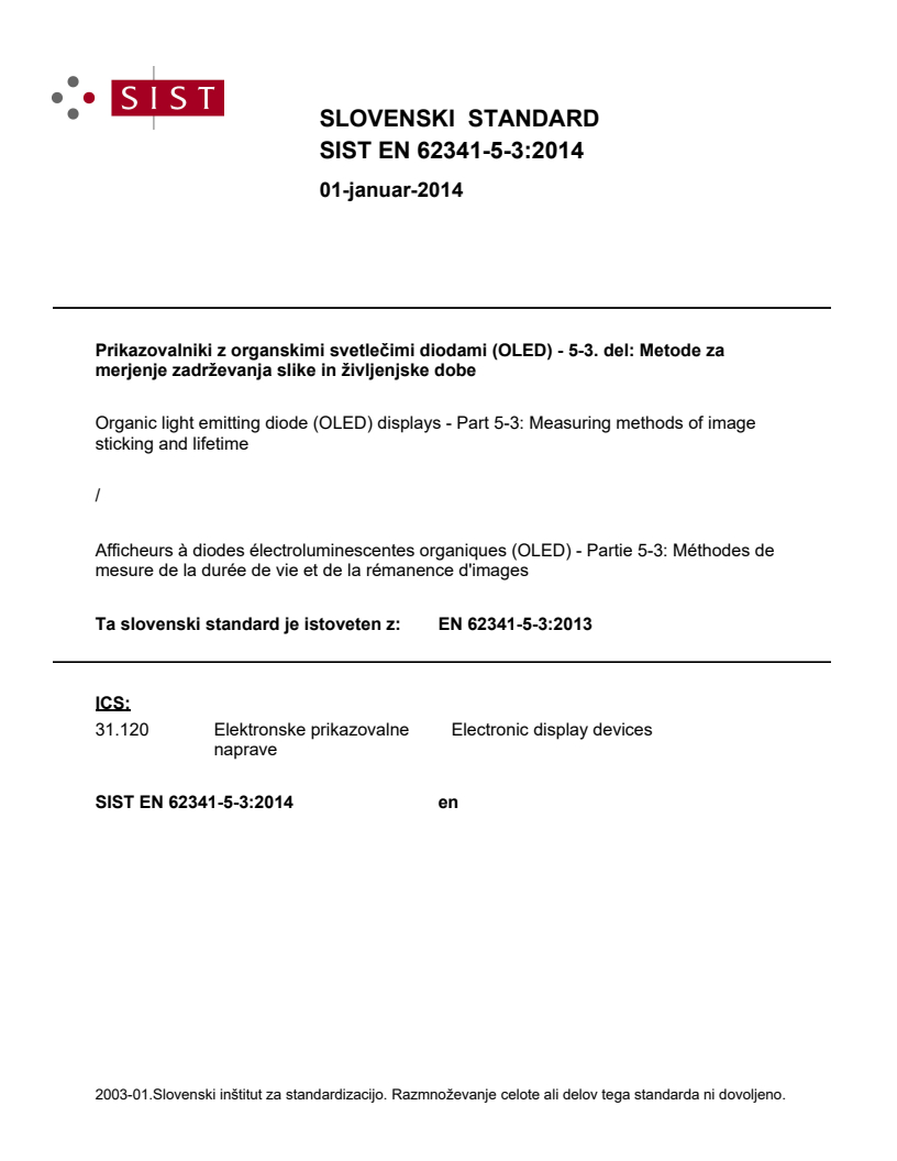 IEC 62341-5-3:2013 specifies the standard measurement conditions and measurement methods for determining the image sticking and lifetime of organic light emitting diode (OLED) display panels and modules. It mainly applies to modules.