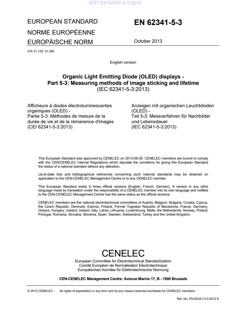 EN 62341-5-3:2013 is a standard published by CLC. Its full title is "Organic Light Emitting Diode (OLED) displays - Part 5-3: Measuring methods of image sticking and lifetime". This standard covers: IEC 62341-5-3:2013 specifies the standard measurement conditions and measurement methods for determining the image sticking and lifetime of organic light emitting diode (OLED) display panels and modules. It mainly applies to modules.
