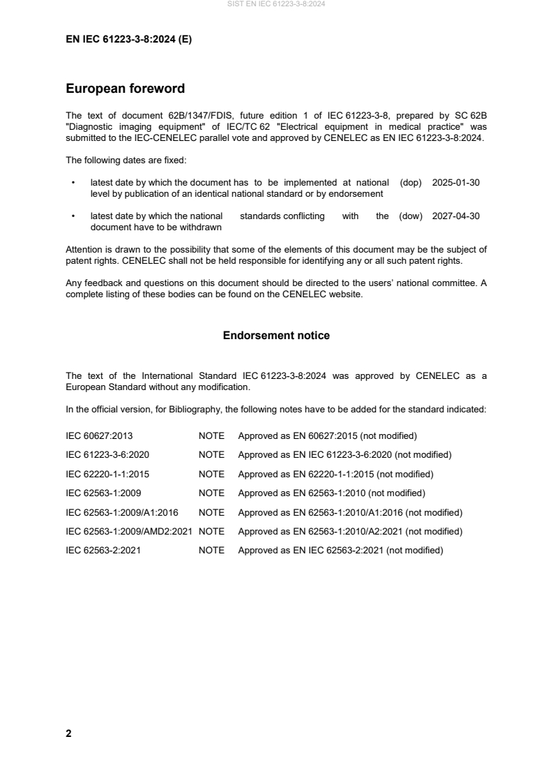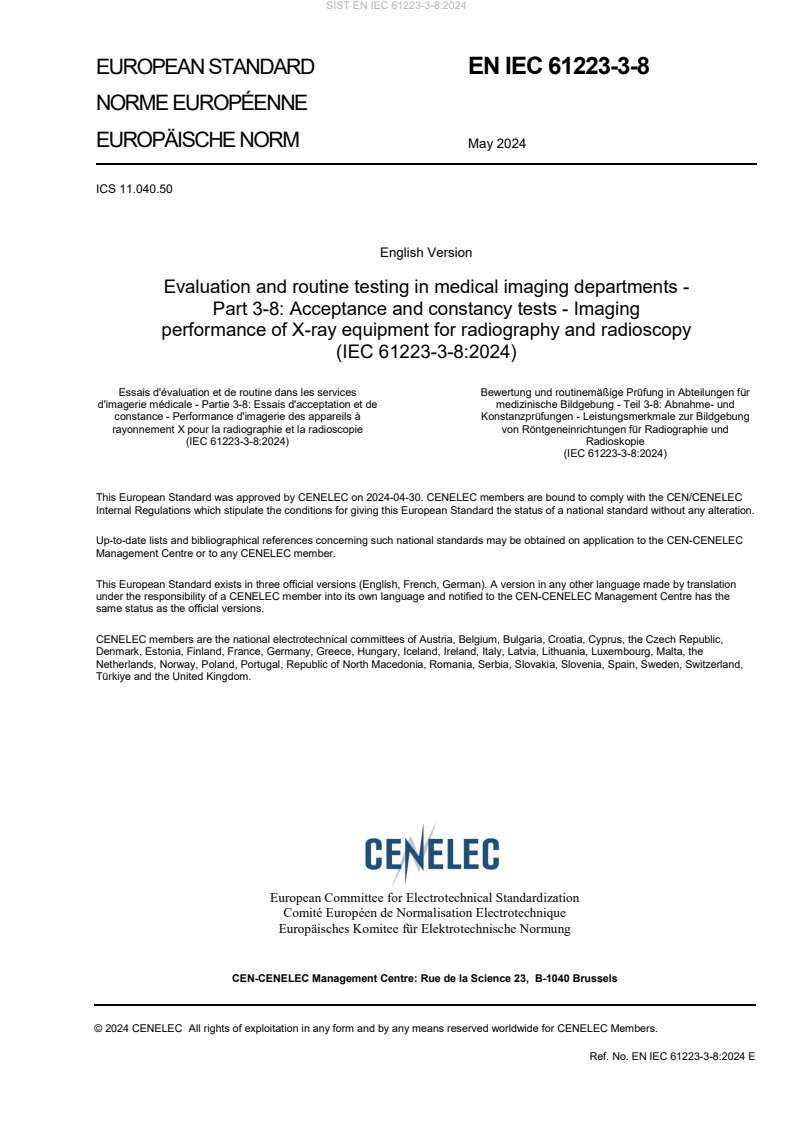 Keywords: IEC 61223-3-8:2024, SIST EN IEC 61223-3-8, acceptance tests, constancy tests, X‑ray equipment, radiography, radioscopy, quality control, medical imaging, phantoms, dosimeter, baseline values.