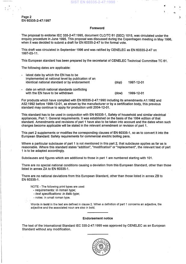 EN 60335-2-47:1997 is a standard published by CLC. Its full title is "Safety of household and similar electrical appliances - Part 2-47: Particular requirements for commercial electric boiling pans". This standard covers: Deals with the safety of electrically operated commercial boiling pans not intended for household use, their rated voltage being not more than 250 V for single-phase appliances connected between one phase and neutral, and 480 V for other appliances. These appliances are used, for example, in kitchens such as in restaurants, canteens, hospitals and commercial enterprises such as bakeries, butcheries, etc...