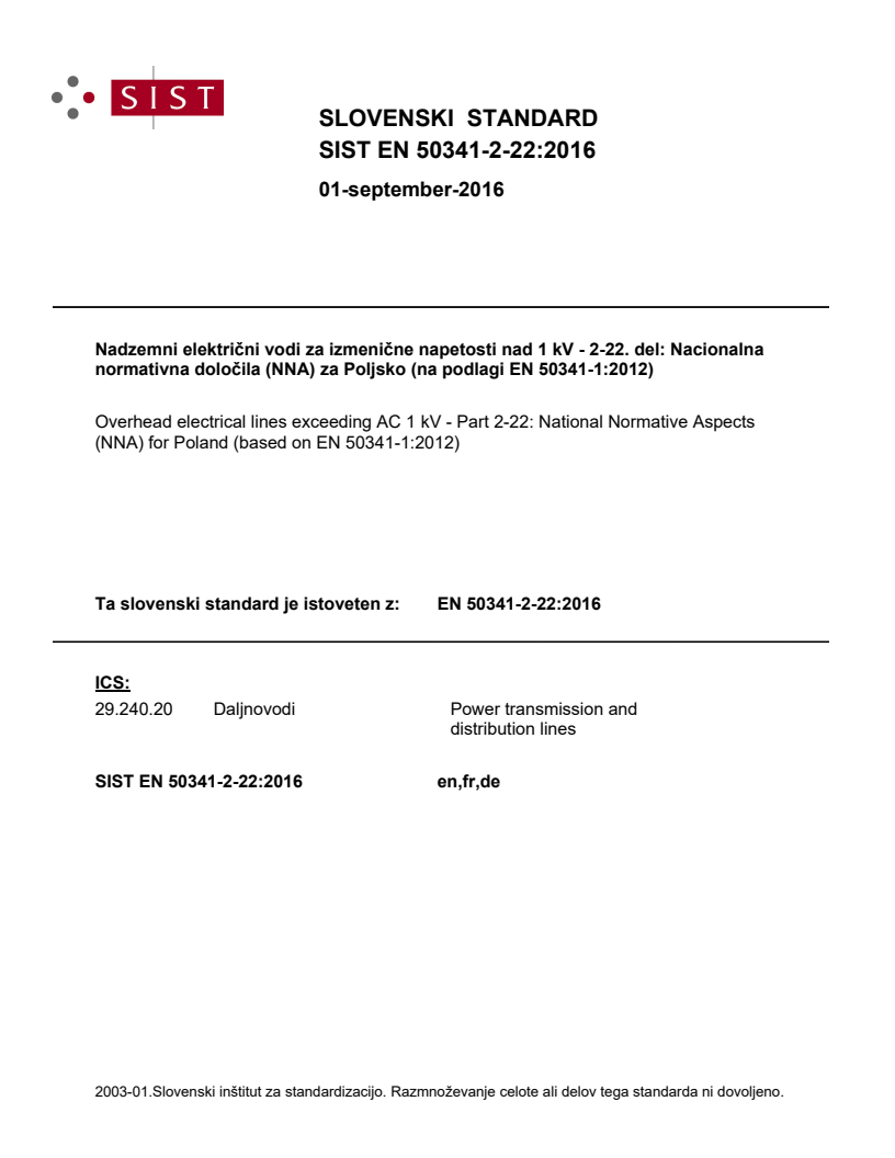 Nadzemni električni vodi za izmenične napetosti nad 1 kV - 2-22. del: Nacionalna normativna določila (NNA) za Poljsko (na podlagi EN 50341-1:2012)