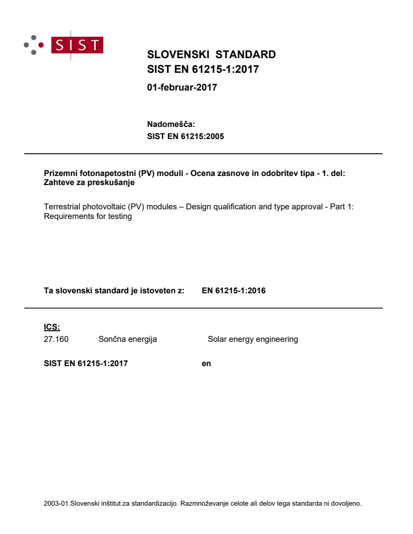 Ta slovenski standard je istoveten z: EN 61215-1:2016