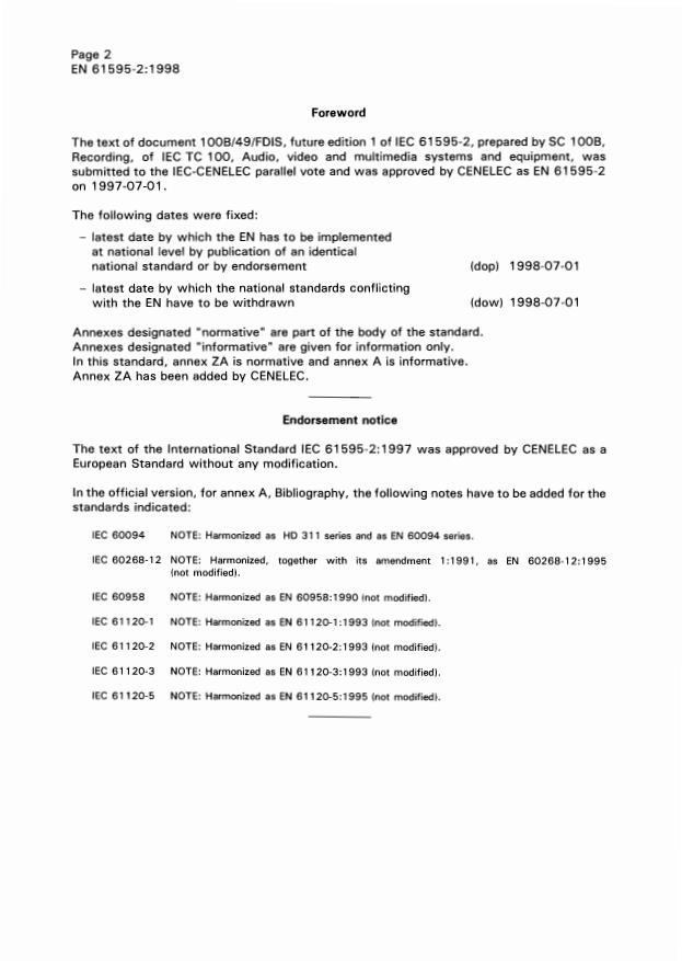 EN 61595-2:1998 has the following relationships with other standards: It is inter standard links to HD 507 S1:1988, EN 61120-4:1992. Understanding these relationships helps ensure you are using the most current and applicable version of the standard.