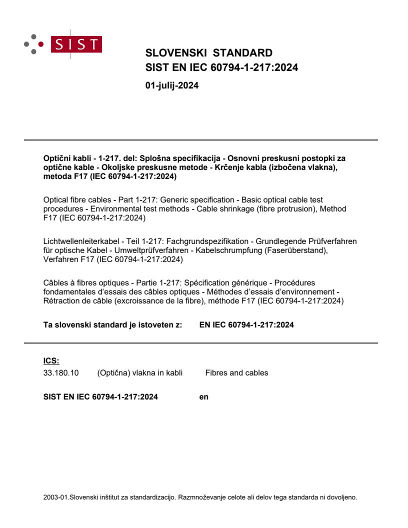 Skupina standardov IEC 60794-1-217:2024 določa preskusni postopek za merjenje trajne izbočenosti vlaken v primerjavi s kabelskimi elementi in plaščem zaradi izpostavljenosti kabla toploti. Dokument delno nadomešča standard IEC 60794‑1‑22:2017. Ta izdaja je tehnično popravljena izdaja. Ta izdaja v primerjavi s standardom IEC 60794-1-22:2017 vključuje naslednje pomembne tehnične spremembe: