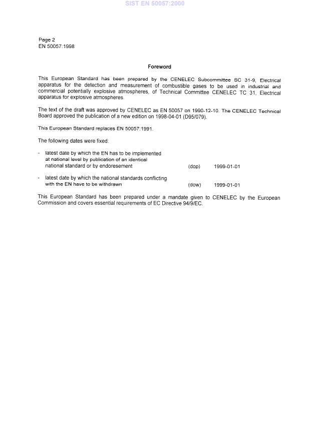 EN 50057:1998 is a standard published by CLC. Its full title is "Electrical apparatus for the detection and measurement of combustible gases - Performance requirements for Group II apparatus indicating up to 100 % lower explosive limit". This standard covers: This European Standard specifies performance requirements for Group II (as defined in EN 50054) portable, transportable and fixed apparatus for the detection and measurement of combustible gas or vapour concentrations with air. The apparatus, or parts thereof, may be installed or used in potentially explosive atmospheres, other than mines susceptible to firedamp (i.e. Group I). The general requirements and test methods applicable to the apparatus covered by this European Standard are specified in EN 50054. This European Standard is restricted to apparatus intended for the detection and measurement of combustible gas or vapour concentrations with air up to 100 % lower explosive limit (LEL). NOTE: Although apparatus of the types covered by this European Standard may be suitable for detecting a wide range of combustible gases, particular gases (e.g. methane or propane) are specified in EN 50054 as the components of the test gases for the purpose of practical convenience. The performance requirements specified in this European Standard must therefore be regarded with caution when the apparatus is used to detect other combustible gases, as some parameters - such as speed of response - will be modified