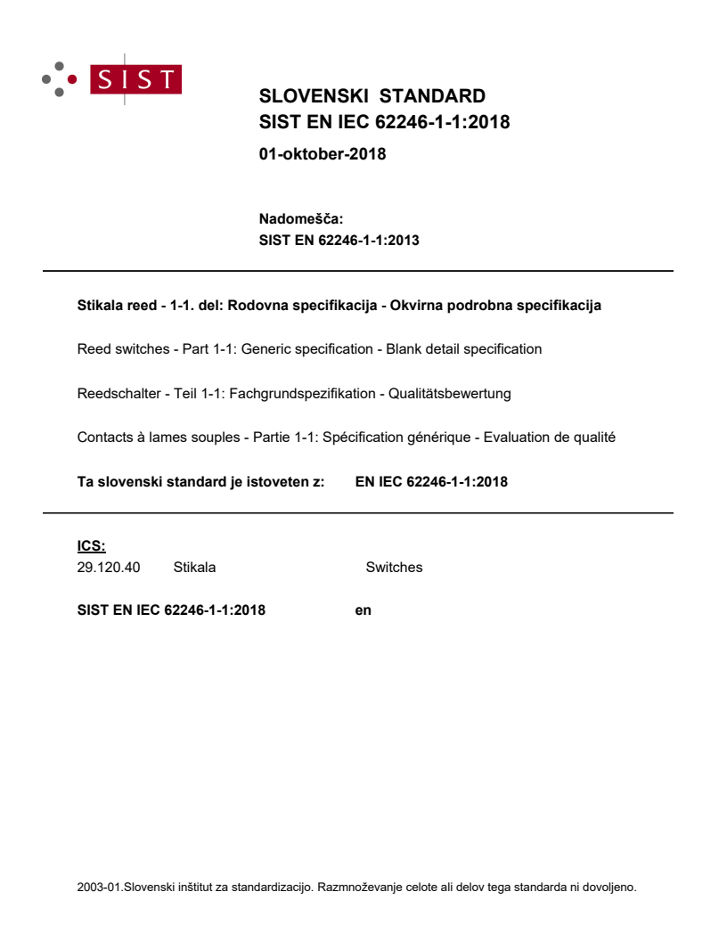 Ta del standarda IEC 62246, ki je okvirna podrobna specifikacija, opredeljuje zahteve in preskuse stikal reed za splošno in industrijsko uporabo.