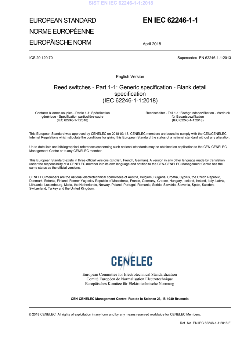 Keywords: IEC 62246-1-1, EN IEC 62246-1-1:2018, reed switch standard, blank detail specification, reed switches, reliability testing, quality conformance.