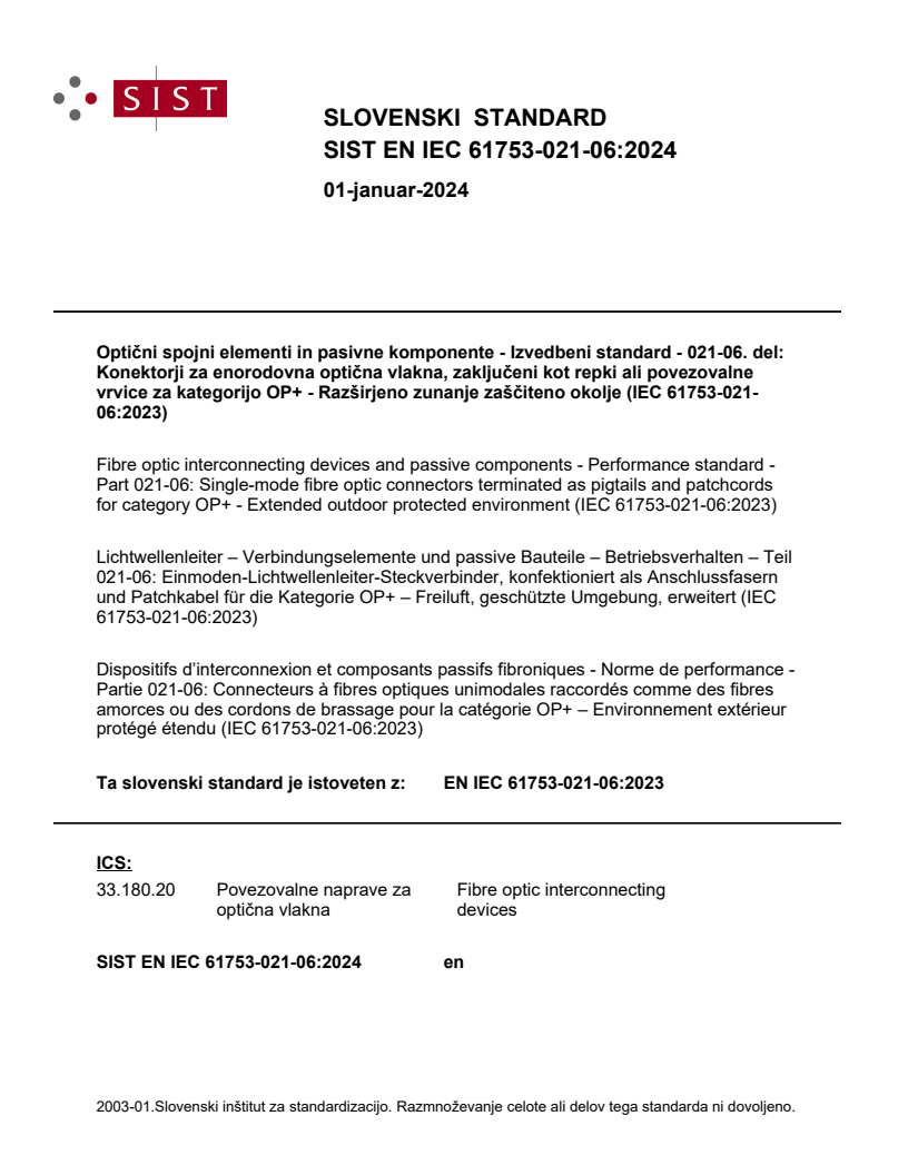Standard IEC 61753-021-06:2023 določa minimalne zahteve in stopnje zahtevnosti glede začetnega preskusa ter meritev, ki jih morajo izpolnjevati konektorji za enorodovna optična vlakna, zaključeni kot repki ali povezovalne vrvice, da ustrezajo standardu IEC za kategorijo OP+ (razširjeno zunanje zaščiteno okolje), kot je opredeljeno v standardu IEC 61753-1. Če so bili preskusi izvedeni na konektorjih, zaključenih kot repki ali povezovalne vrvice, za kategorijo OP+HD in je izdelek preskus opravil, se samodejno šteje, da ustreza standardu IEC za kategorijo OP+. Če se preskusi izvedejo na konektorjih, zaključenih kot repki ali povezovalne vrvice, za kategorijo OP+ in izdelek preskus opravi, se samodejno šteje, da ustreza standardu IEC za kategoriji OP in C. Ta prva izdaja razveljavlja in nadomešča drugo izdajo standarda IEC 61753-021-6, objavljeno leta 2007. Ta izdaja je tehnično popravljena izdaja. Ta izdaja v primerjavi s standardom IEC 61753-021-6:2007 vključuje naslednje pomembne tehnične spremembe: