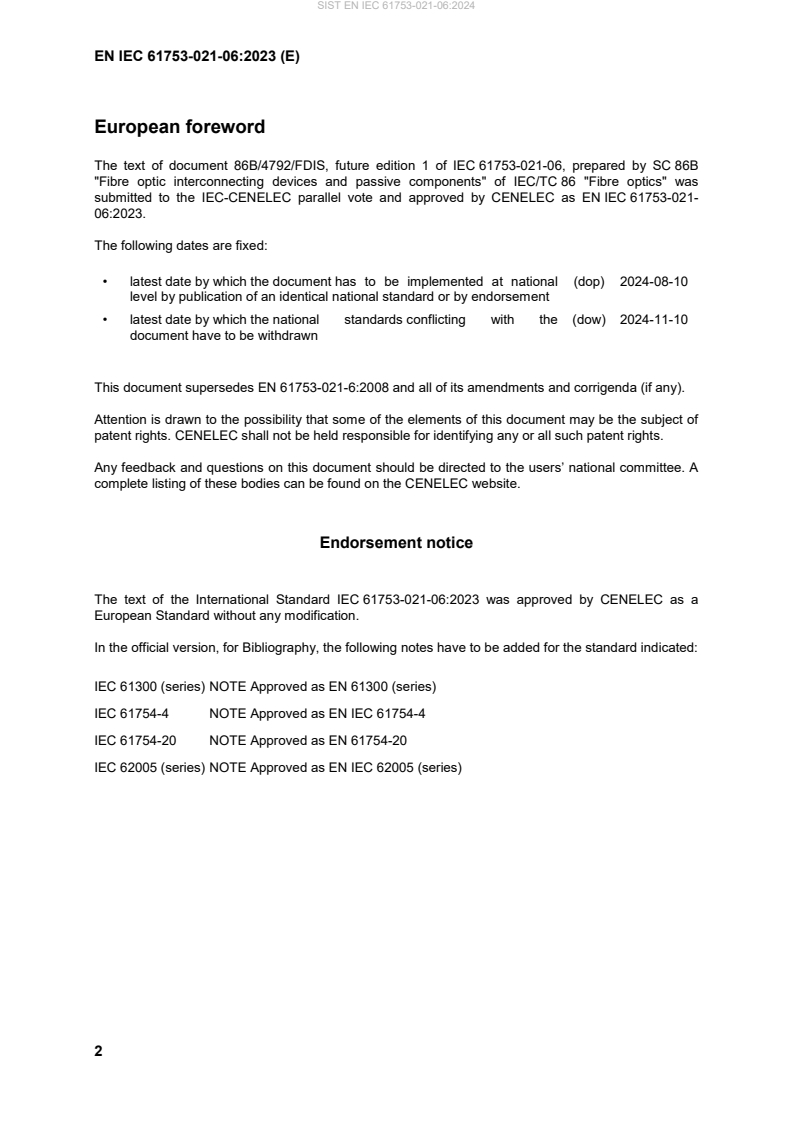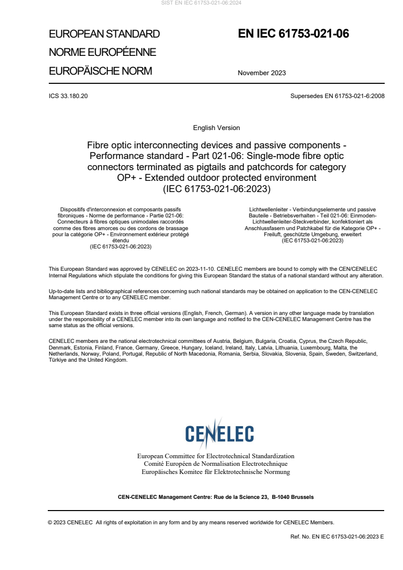 EN IEC 61753-021-06:2023 is a standard published by CLC. Its full title is "Fibre optic interconnecting devices and passive components - Performance standard - Part 021-06: Single-mode fibre optic connectors terminated as pigtails and patchcords for category OP+ – Extended outdoor protected environment". This standard covers: IEC 61753-021-06:2023 defines the minimum initial test and measurement requirements and severities which single-mode fibre optic connectors terminated as a pigtail or a patchcord satisfy in order to be categorised as meeting the IEC standard category OP+ (extended outdoor protected environment), as defined in IEC 61753-1. If tests were performed on the connectors terminated as pigtails or patchcords for category OP+HD and the product passed, the product will be automatically qualified or categorized as meeting the IEC standard for category OP+. If tests are performed on the connectors terminated as pigtails or patchcords for category OP+, and the product passes, the product will be automatically qualified or categorized as meeting the IEC standard for categories OP and C. This first edition cancels and replaces the first edition of IEC 61753-021-6 published in 2007. This edition constitutes a technical revision. This edition includes the following significant technical changes with respect to IEC 61753-021-6:2007: a) updated environmental category (from O to OP+), tests and their severities according to IEC 61753-1:2018; b) removed the copyright notice as it is no longer needed; c) changed title and scope to remove restrictions on attenuation and return loss grades; d) changed the term and definitions of the different types of test samples (pigtail test samples and patchcord test samples) used in the various tests to avoid confusion; e) removed the term and definition for small form factor (SFF) connectors as it is no longer used in the document; f) updated fibre naming conventions according to IEC 60793-2-50: and added provisions for B-657 fibres; g) added all the attenuation and return loss grades defined in IEC 61753-1; h) removed the static side load test; i) removed the need to perform all tests sequentially to align with other performance standards; j) added provisions for rectangular ferrule connectors; k) added Annex B for visual examination of the outer cable sheath movement of reinforced cables as an additional requirement for change of temperature, cable retention and flexing of the strain relief tests.