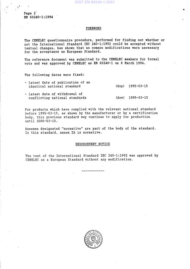Ta slovenski standard je istoveten z: EN 60240-1:1994
