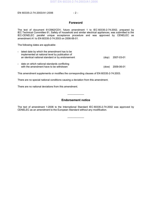 This amendment A1 modifies the European Standard EN 60335-2-74:2003; it was approved by CENELEC